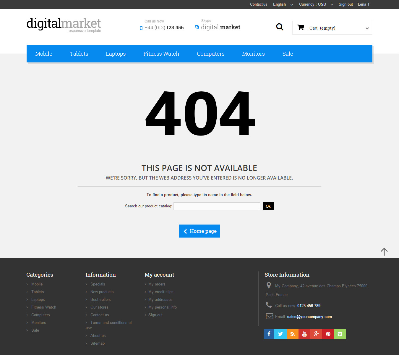 Digital Market Prestashop 1.6 Template is coded by certified professionals for your comfort and store growth. It includes inbuilt functional extensions like: Homefeatured slider on homepage, Static blocks module and Scroll Top module.