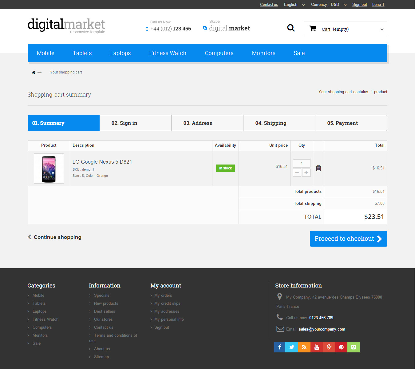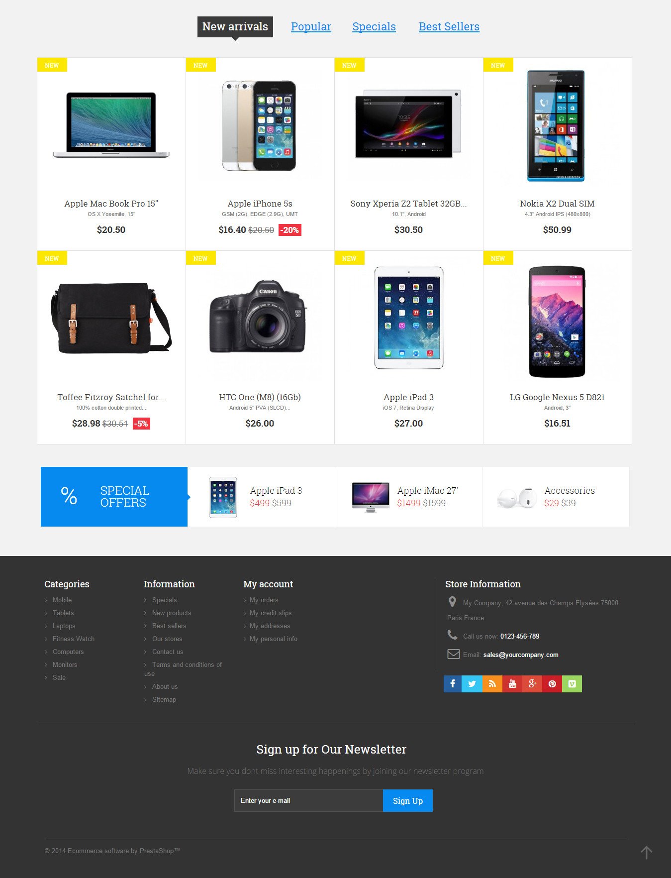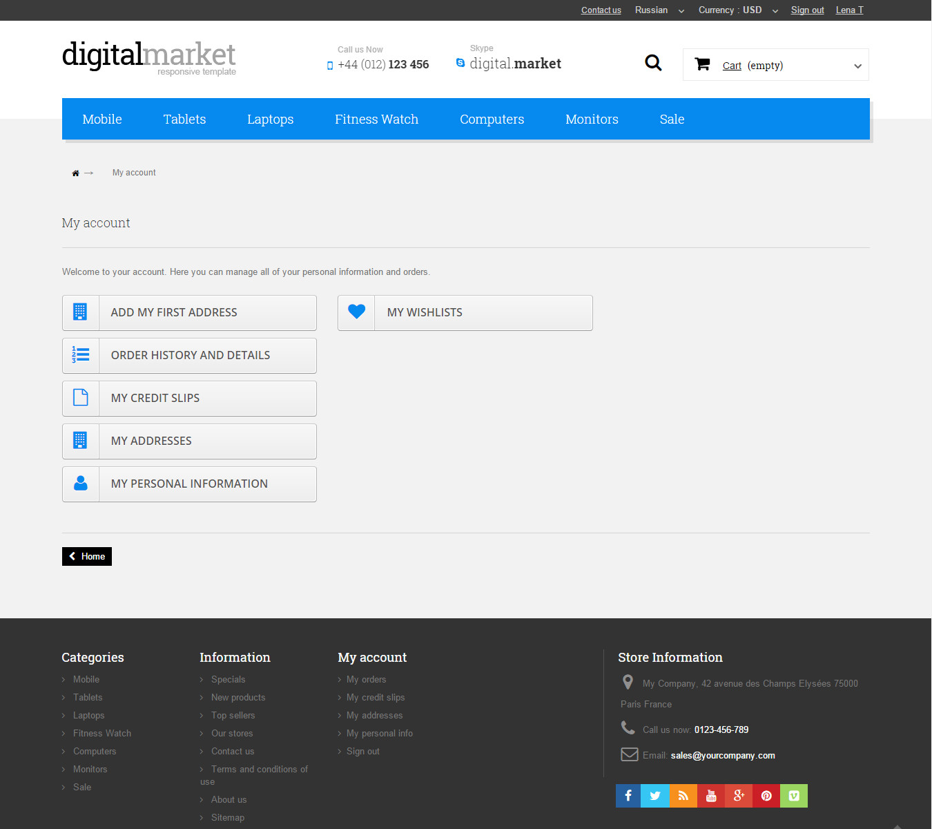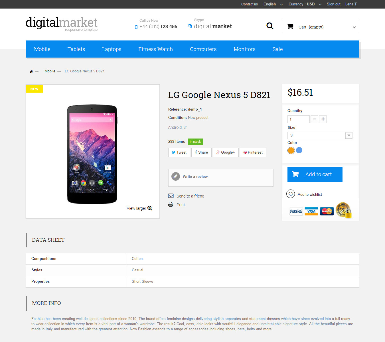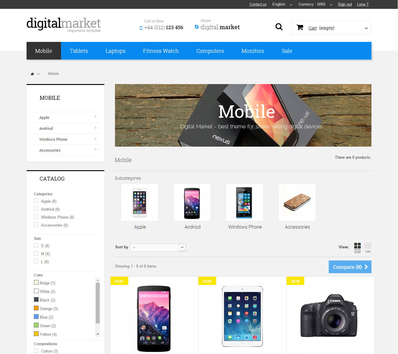 Digital Market is a simple Prestashop 1.6 Template which will suit stores selling digital stuff. The menu is accented with a strict color scheme, improving perception of navigation. The theme is functional and ready to accommodate your extensions. It’s responsive and looks good on mobile devices. Originally meant for digital devices and electronics it’s both functional and neutral enough to present any type of product.