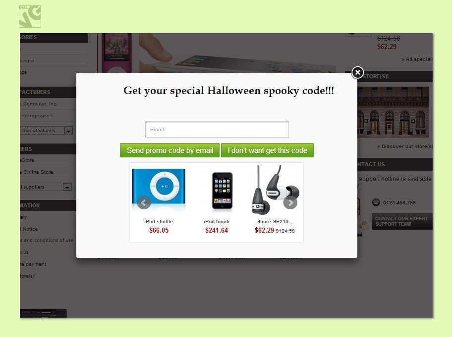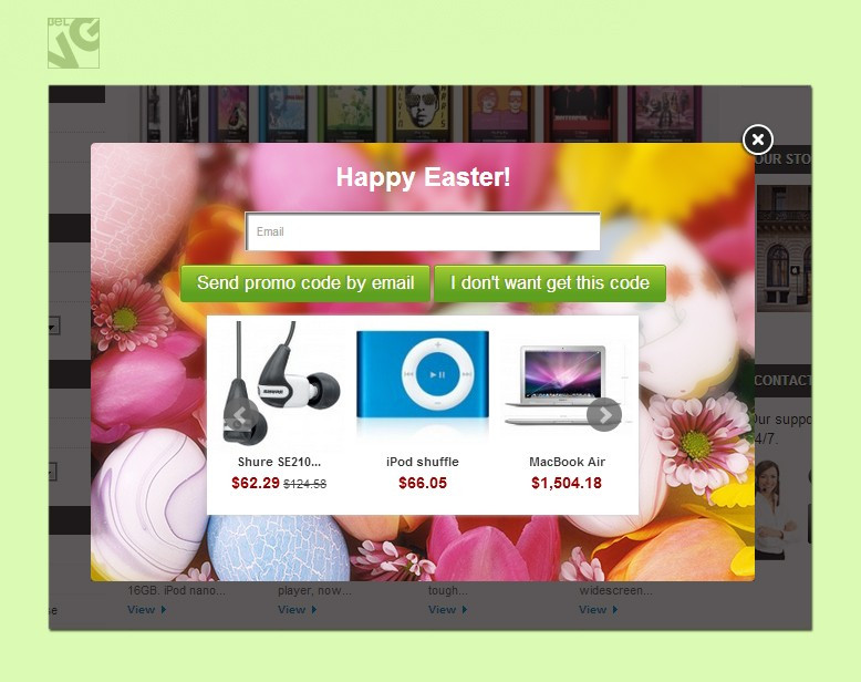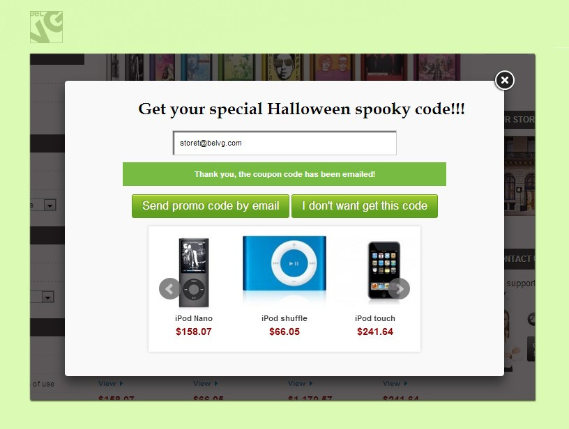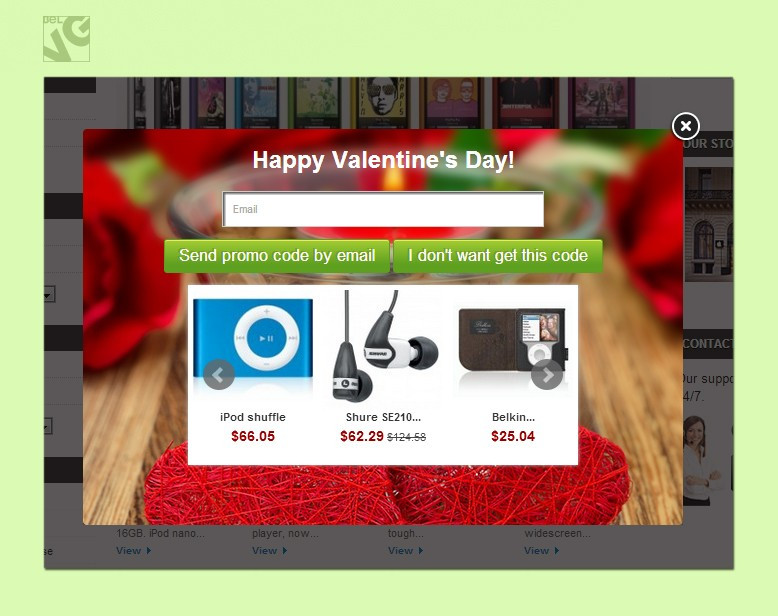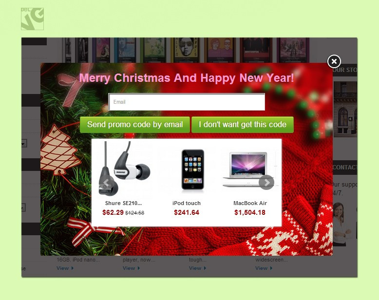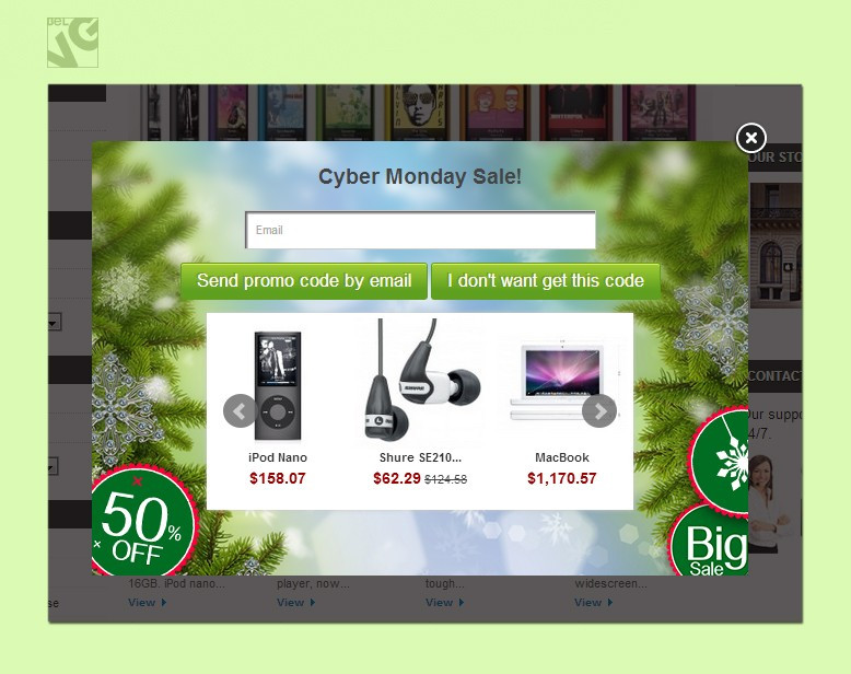 That is why Holiday Sales creates a special promo window which pops-up on every page and where you can display all the necessary information to run a successful sale: show up promoted goods and items under the offer, offer visitors a promo code, collect and create a database of your visitors’ e-mails for your future campaigns!