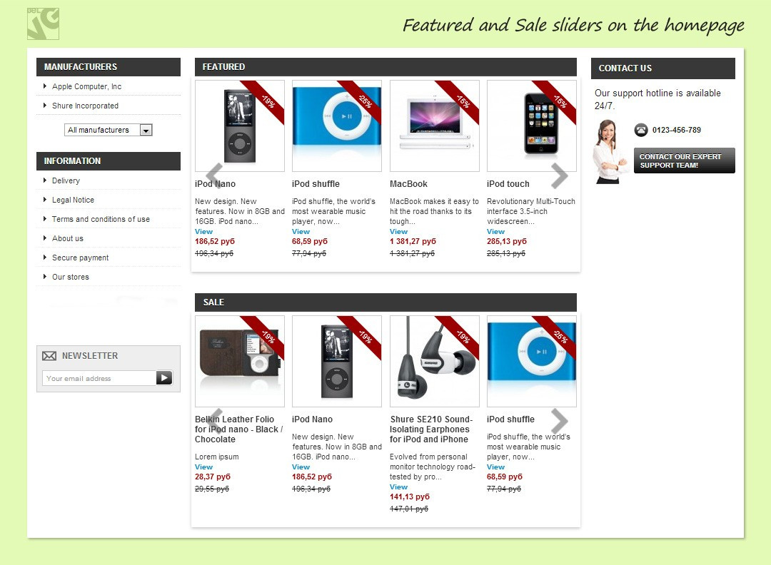 - Links to the product pages and categories in the slider