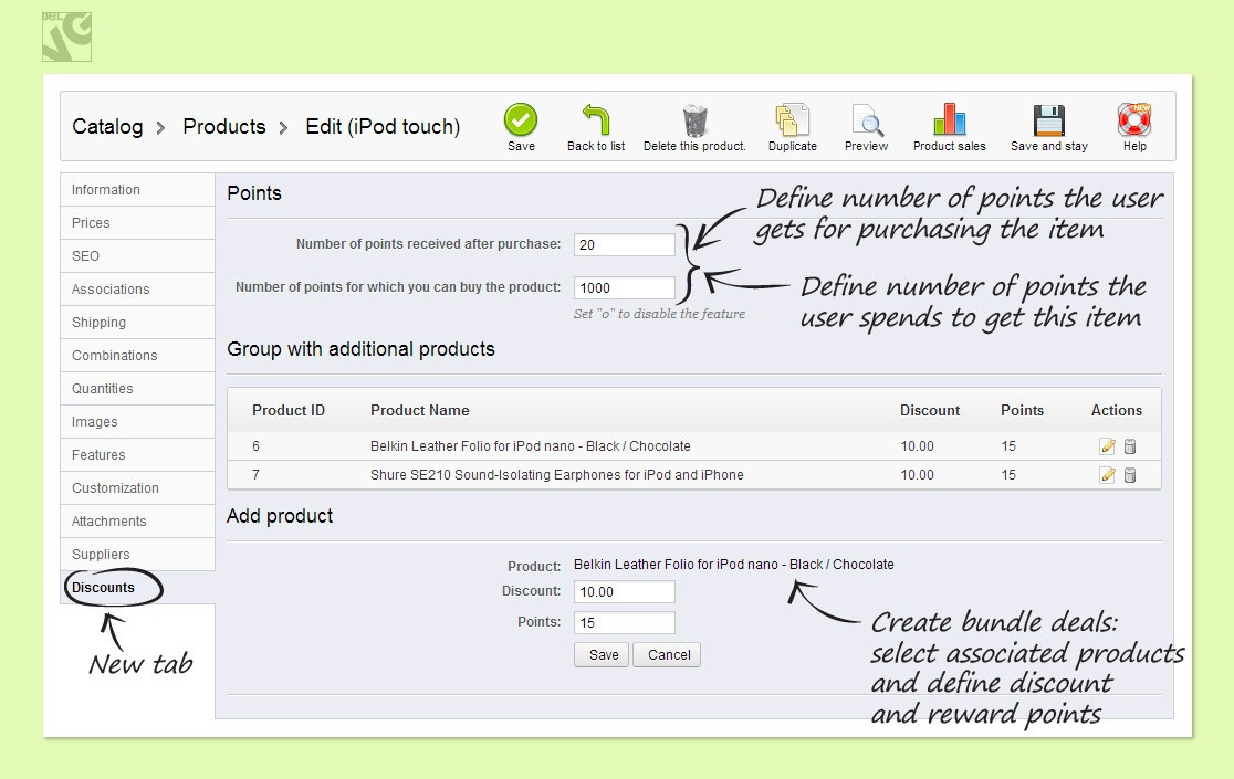 Prestashop Points & Discounts is a powerful marketing tool that allows customers to collect points for purchasing items and spend them on other products in your store as well as to create bundle deals. You can define how many points the user gets and needs for buying this or that product. Assign associated products and create bundle deals to motivate users buy more. Related items can have discounts and point rewards when bought together with the main one.
