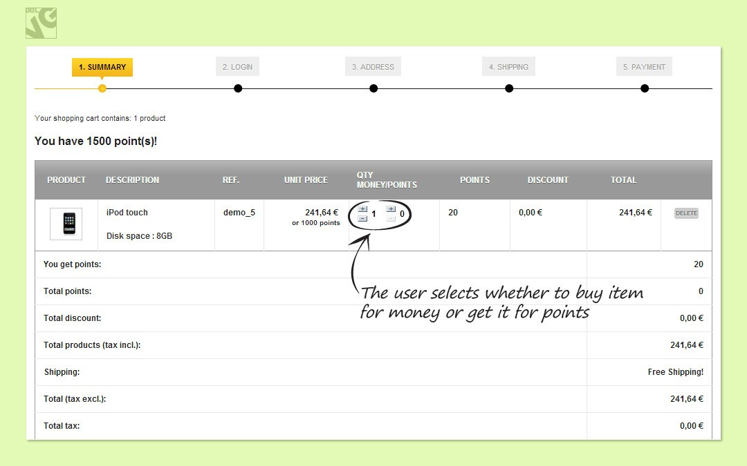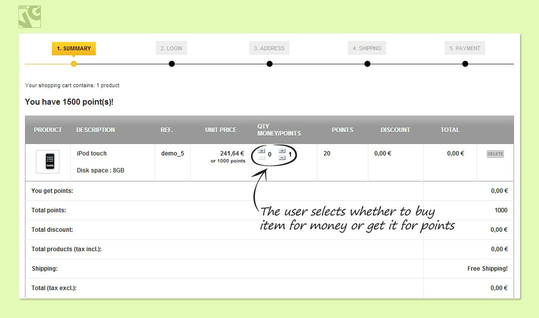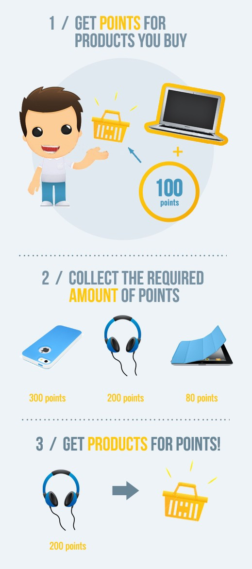 In the back office, define how many points the user gets for buying this or that item. Select reward products as well and configure how many points the customer should collect to get them. Information about products bought for money or got for points can be reflected in the invoice.