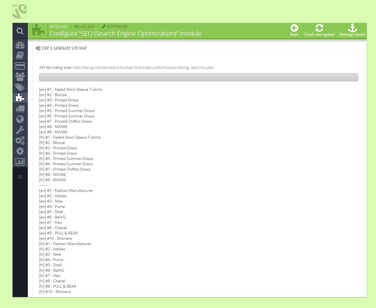 Module's features also include the possibility to generate XML/HTML site-map. However, unlike the default Prestashop site-map this one will also include the list of products, suppliers, manufacturers etc.