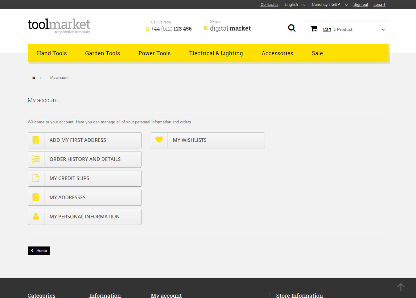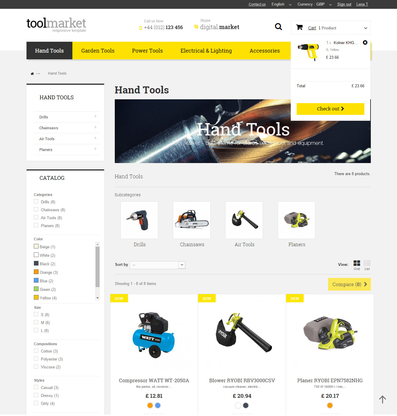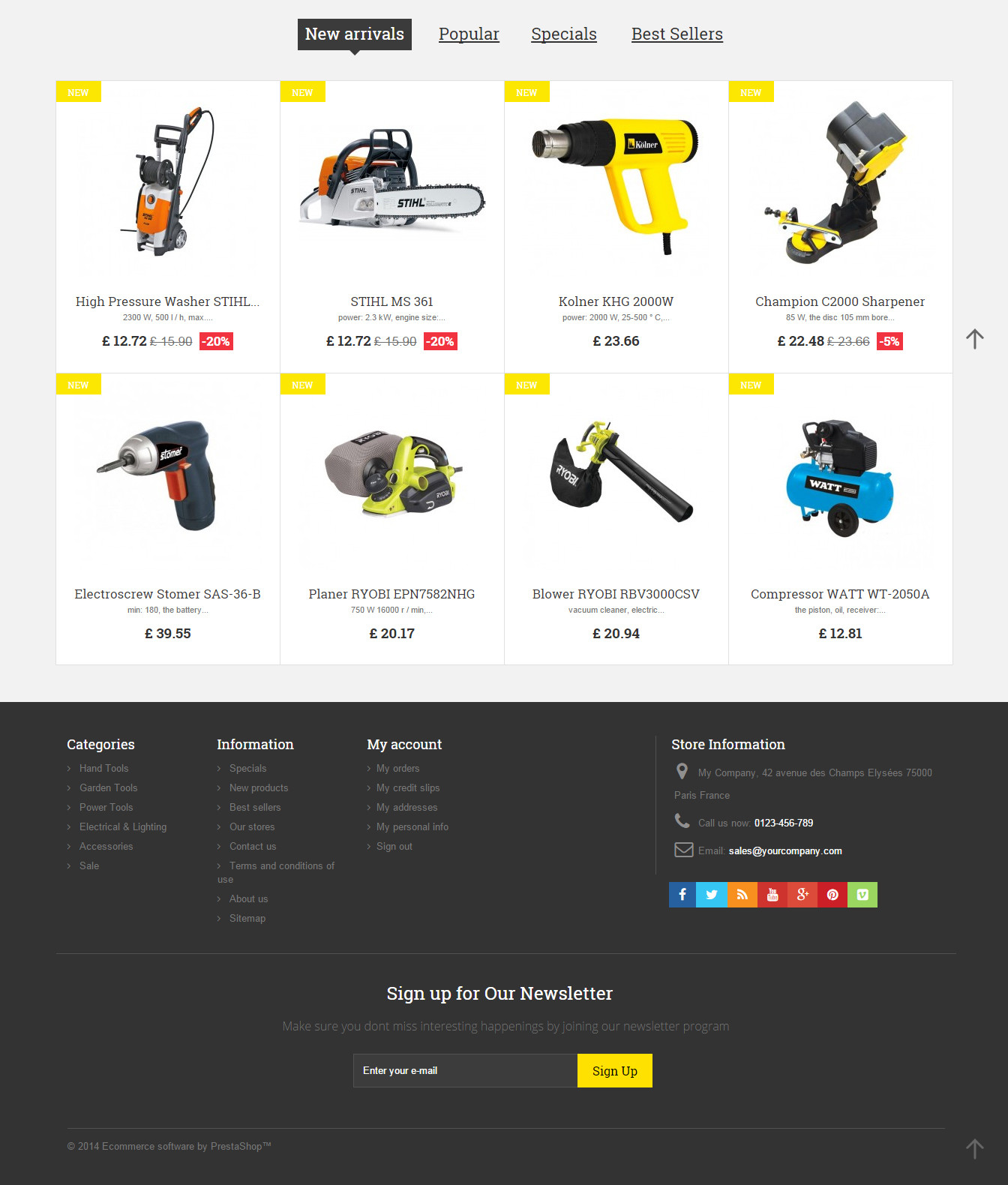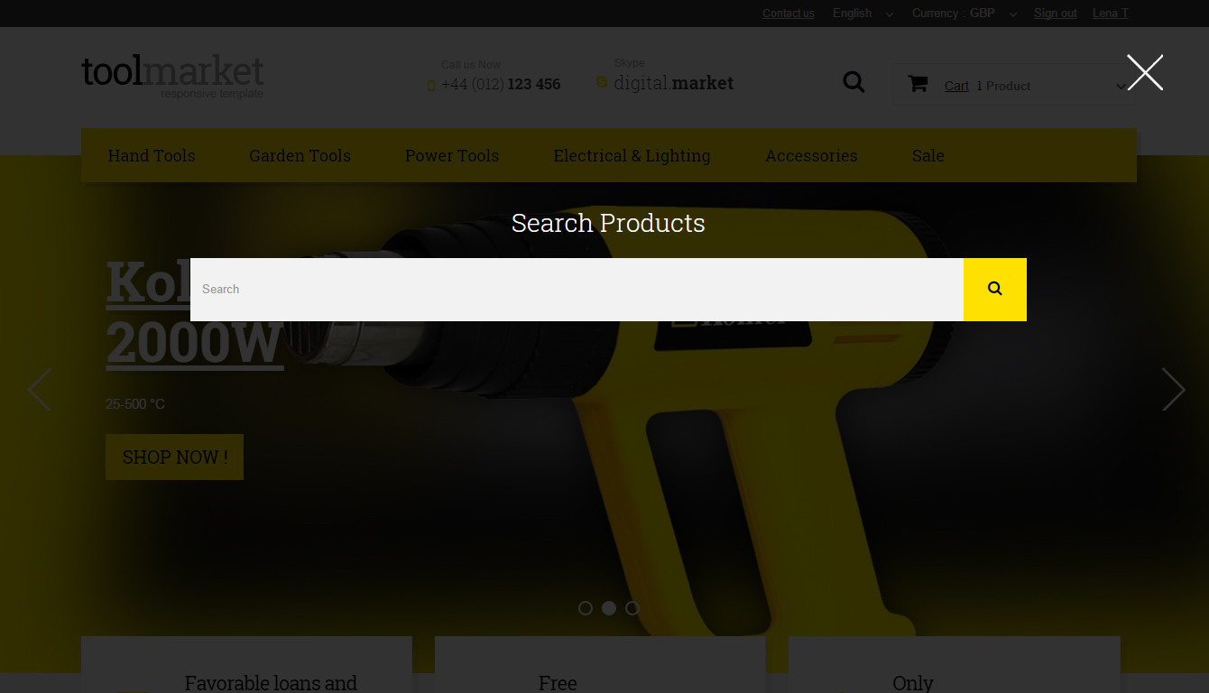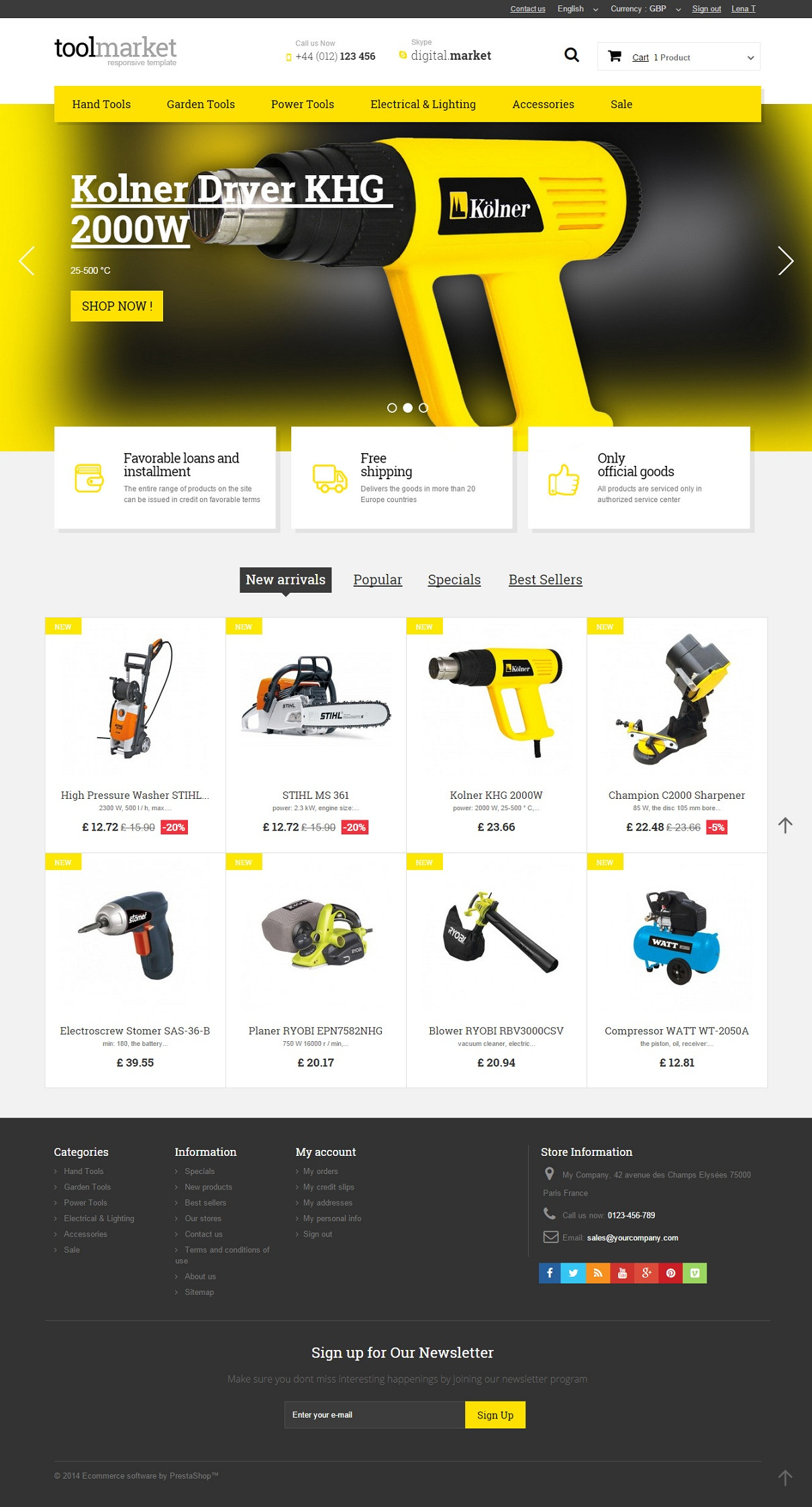 Tools Market Prestashop 1.6 Responsive Theme is a perfect solution for trading tools and appliances. The theme lets you focus only on the main properties of the items in stock, providing all necessary facilities for a successful conversion of visitors into customers. Responsive design makes it look perfect on mobile devices.